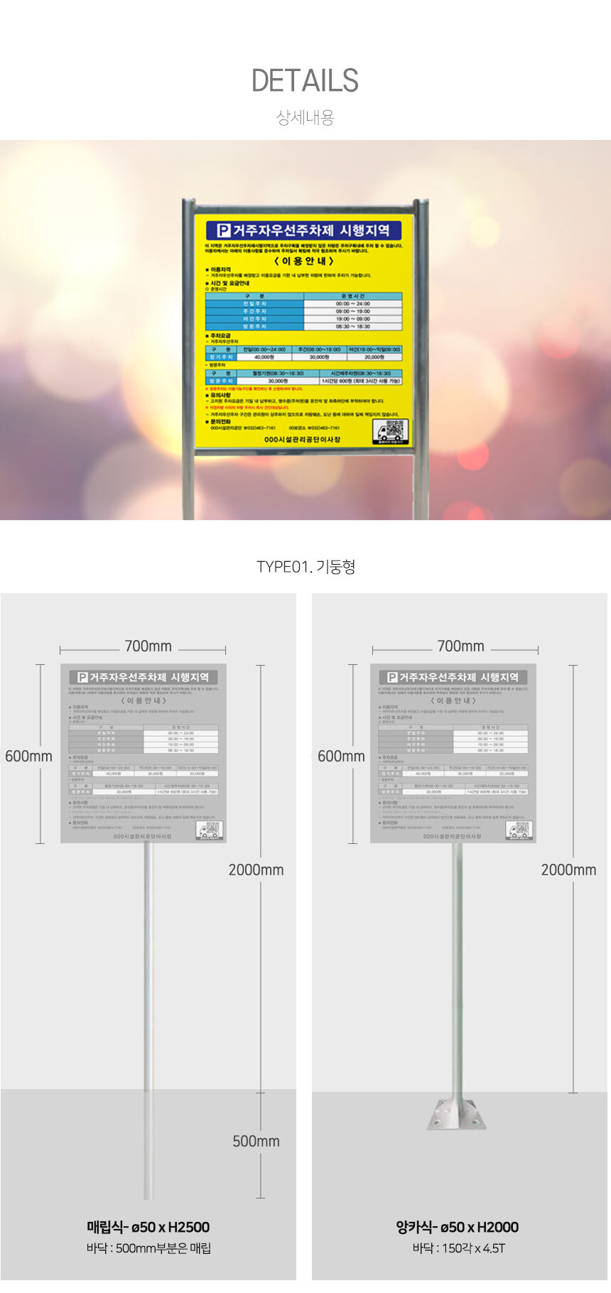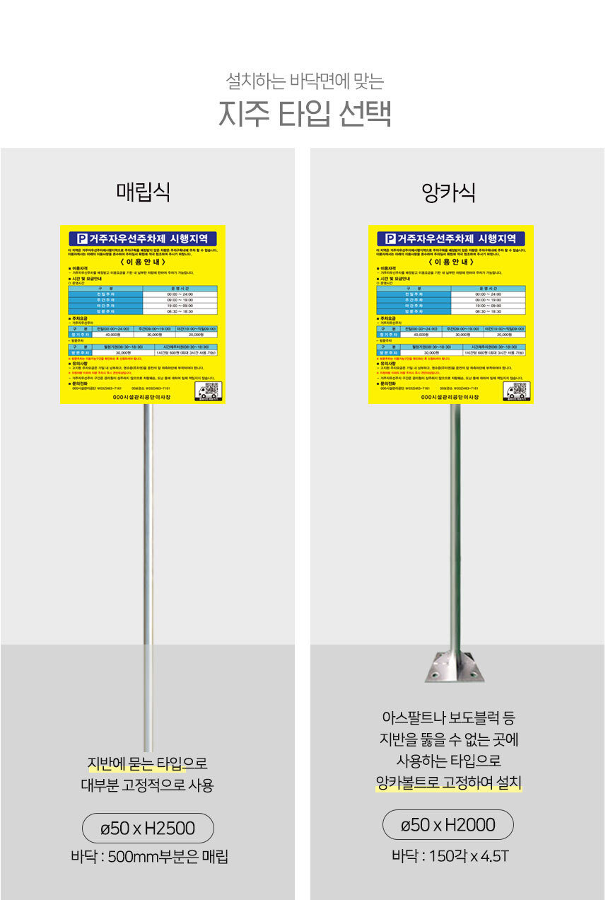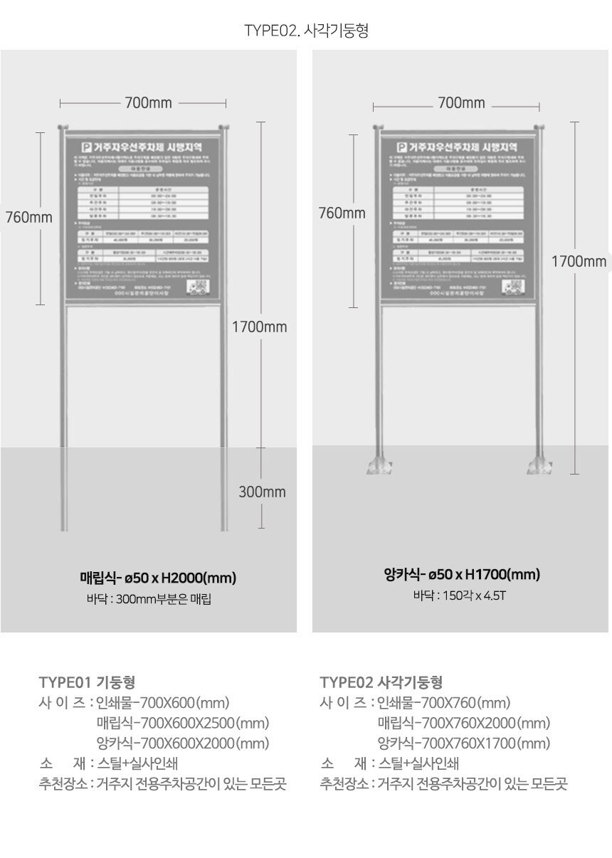 제품사양기둥형 매립식 기둥형 앙카식 사각기둥형 매립식 사각기둥형 앙카식 단면 양면