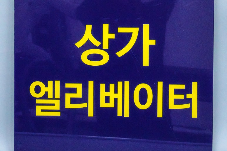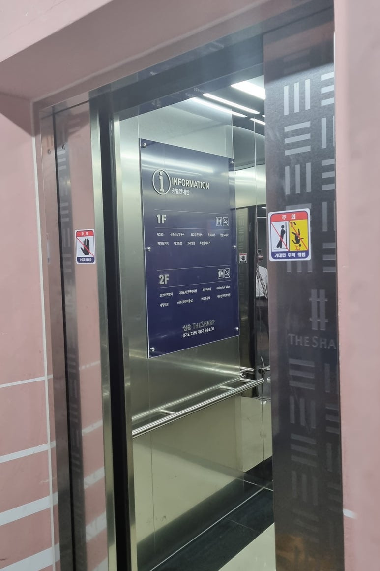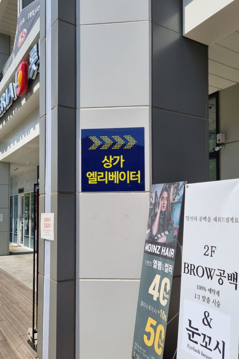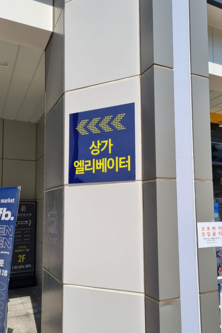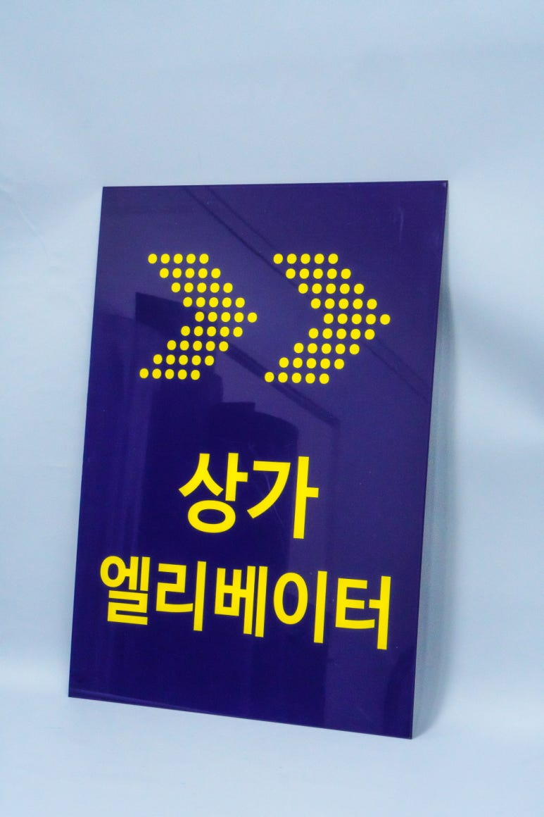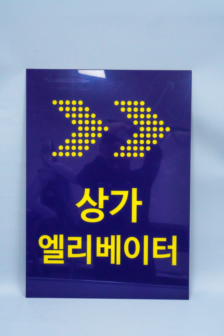하단에는 다른 형태로 제작된 엘리베이터 유도 안내판이 같이 부착된 모습입니다.