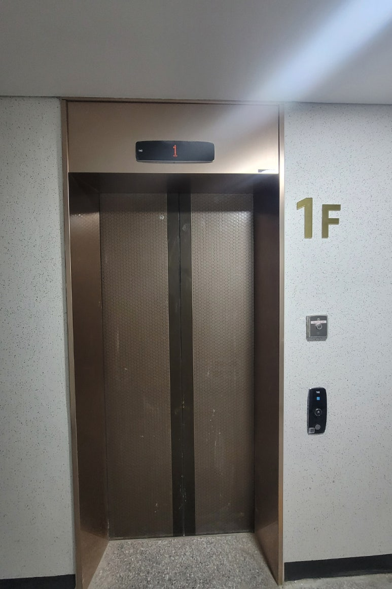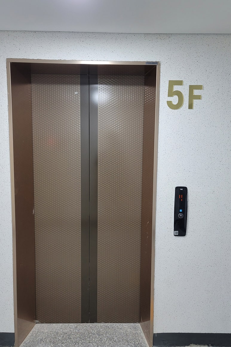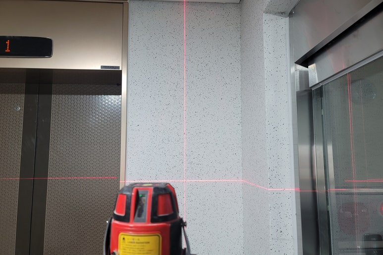 아파트 내 있는 엘리베이터 층수 표시 간판을 설치하기 위해 레이져 포인터로 수평을 표시하여