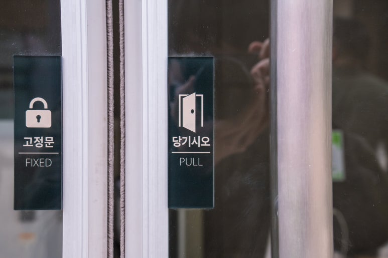 다음은 아크릴 타입의 고정문 당기시오 안내판 입니다!