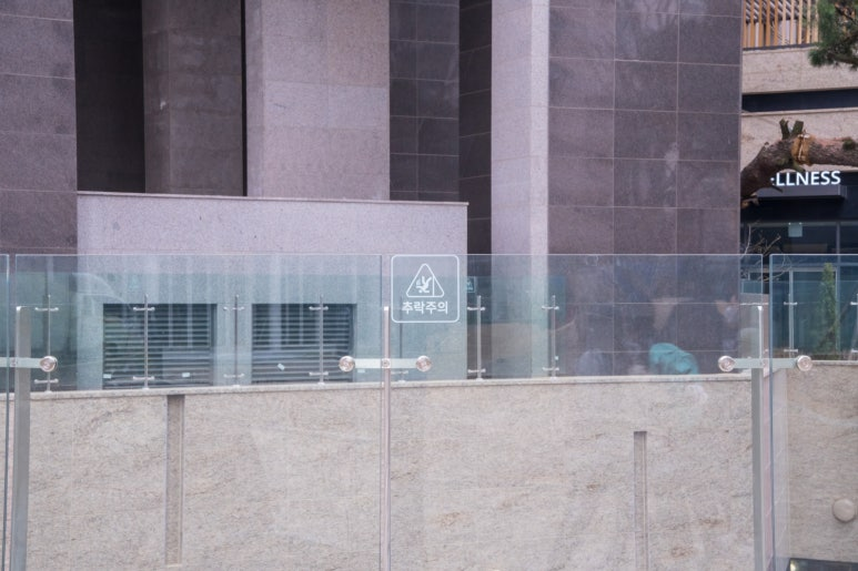 야간에는 유리벽이 안보일 수 있어 추락주의 스티커를 붙여