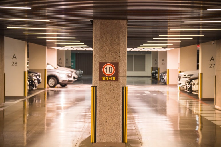 먼저, 주차장 내에서 서행을 해야함을 알리고 규정 속도를 알려주는