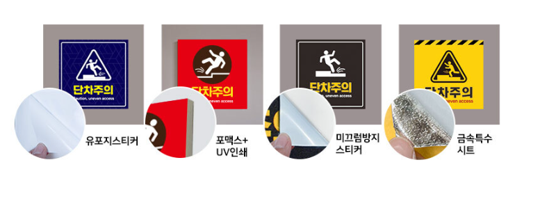 단차주의 안내 스티커의 경우 여러 타입으로 제작이 가능한데요!