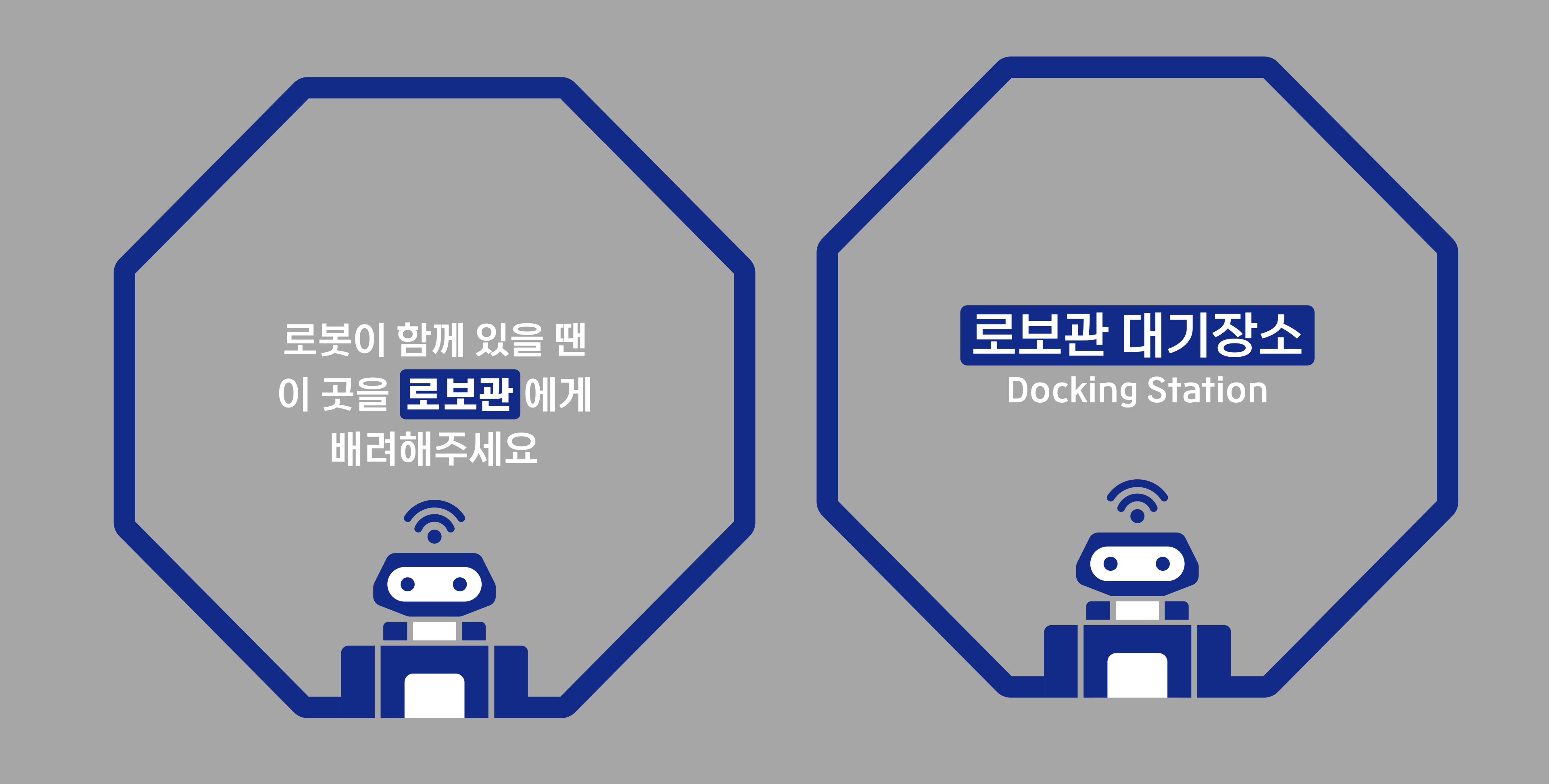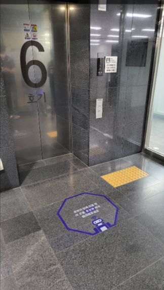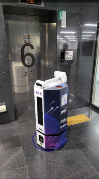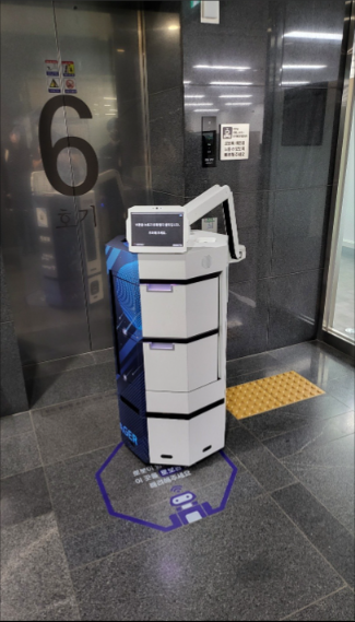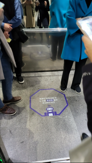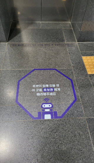 사진에 나오는 바닥스티커는 로보관이 엘리베이터를 탑승할 수 있는 자율주행 로봇으로