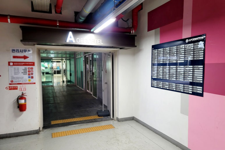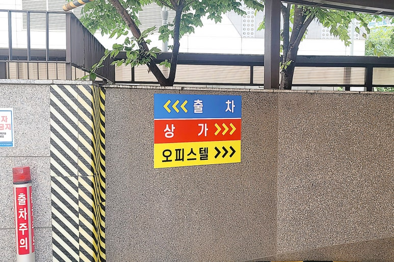 상가와 오피스텔 주차장이 나뉘어 있는 곳이라 대비가 확실한 색상을 사용하여 제작한 안내판으로