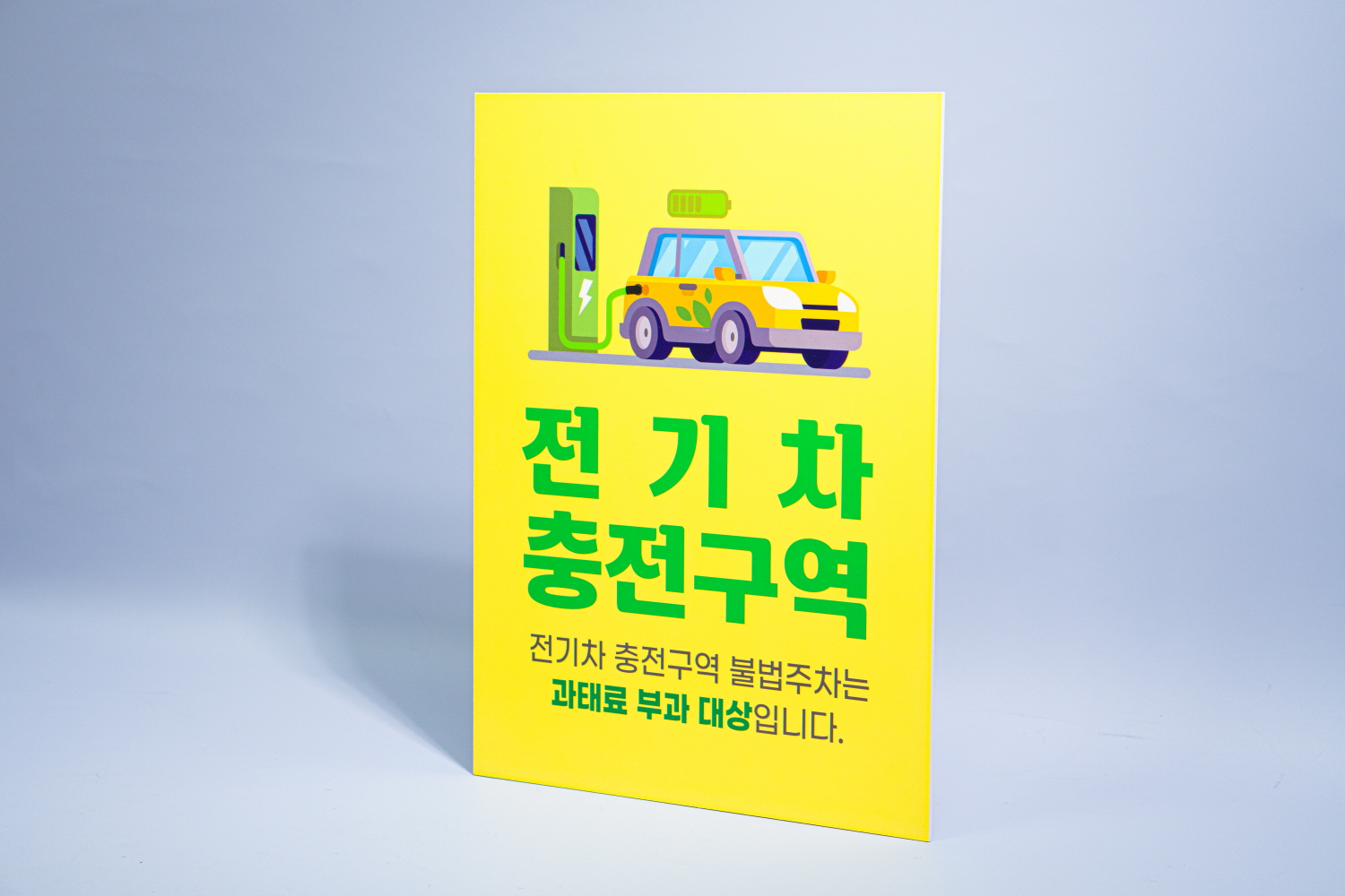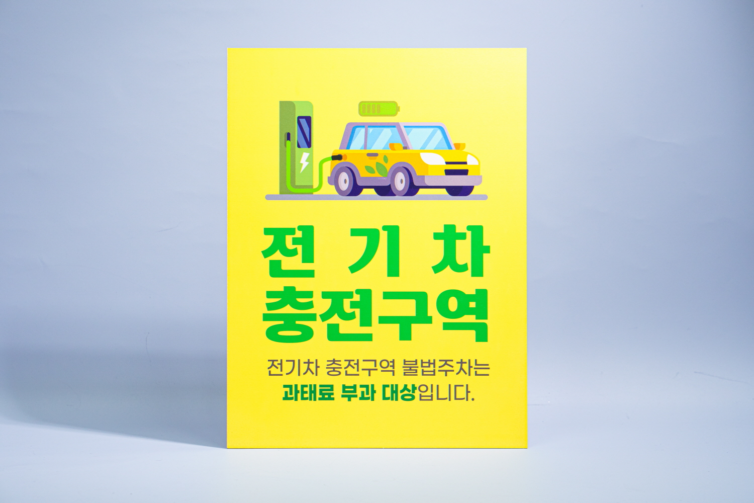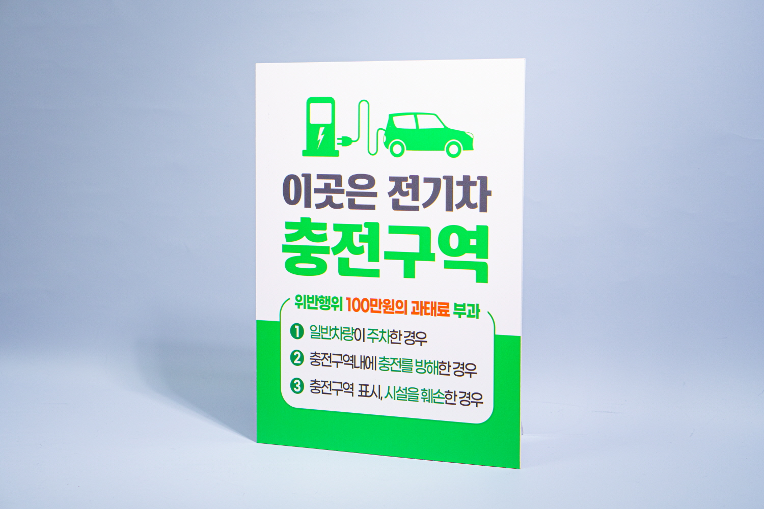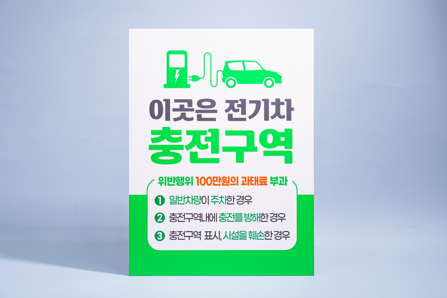 전기 자동차 충전구역을 알리고 전기차량 이외에 다른 차량이 주차하지 못하도록 안내하는 표지판 타입 입니다 !