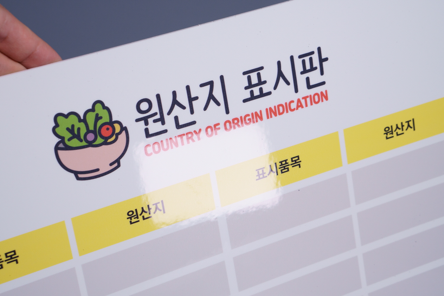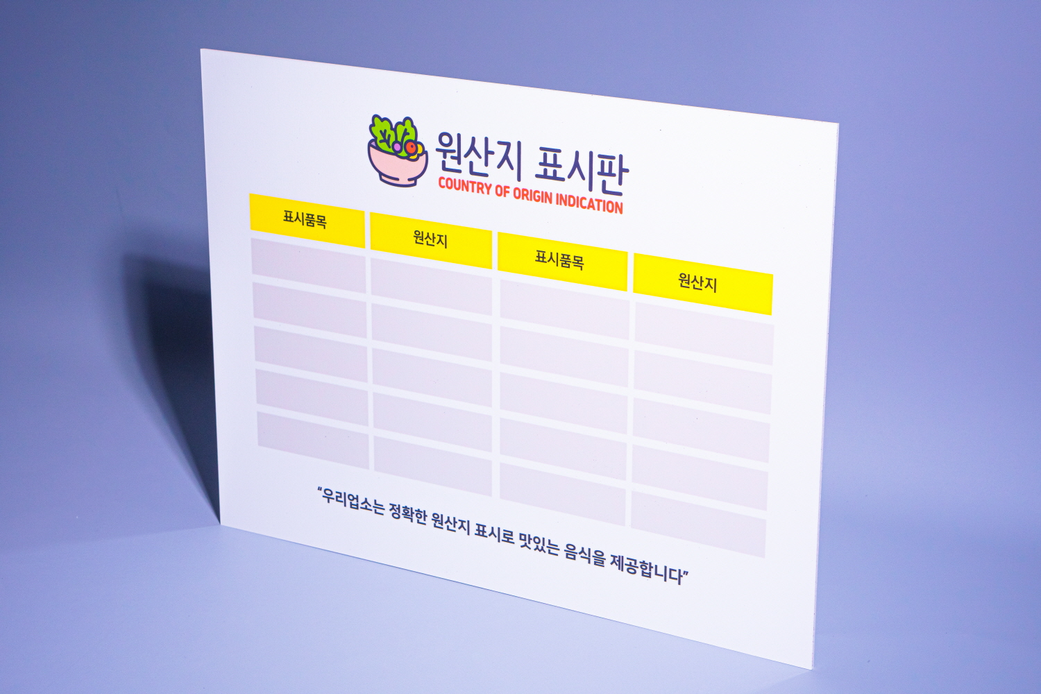 원산지 표시판은 상가, 호텔, 회사, 공공기관 등의 식당 시설에 원산지를 표시하기 위해 제작된 상품입니다.
