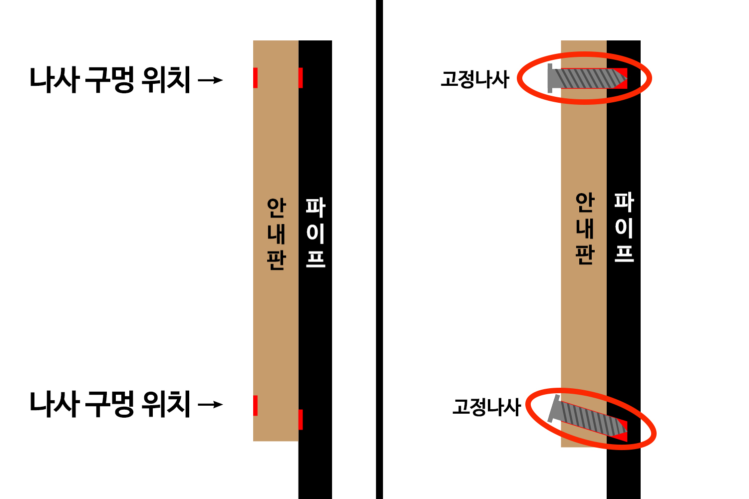 안내판 고정 시 한 곳은 나사가 일자로 들어가는 것이 아닌 비스듬이 고정됩니다.