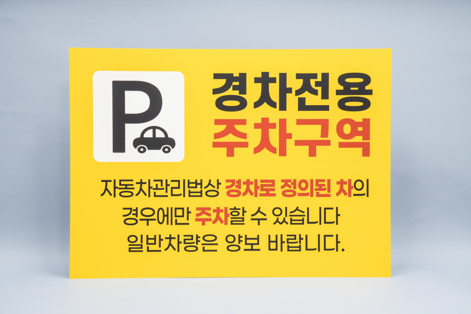 경차전용, 오토바이 주차구역, 전기차 충전구역, 친환경차 주차구역 안내판 을 보여드렸습니다.