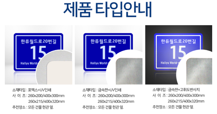 주소 안내판은 포맥스 재질 외에 금속, 반사지 타입으로도 제작이 됩니다.