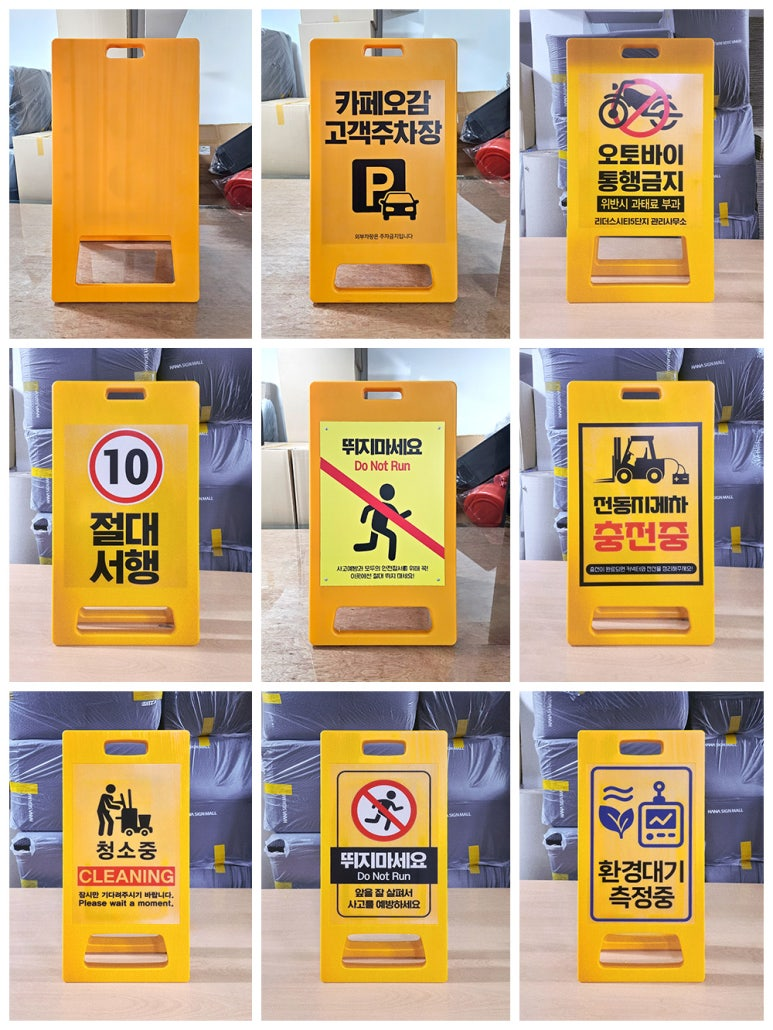 매장 안내, 공장 안전표지, 주차장 안내, 금연·주의·점검 표지 등 다양한 장소에서 활용됩니다.