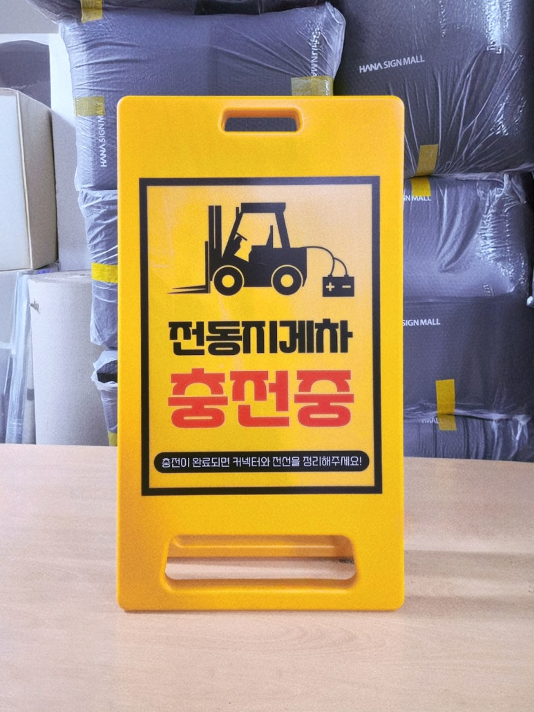 다음은 산업현장에서 사용된 전동지게차 충전중 입간판이에요~