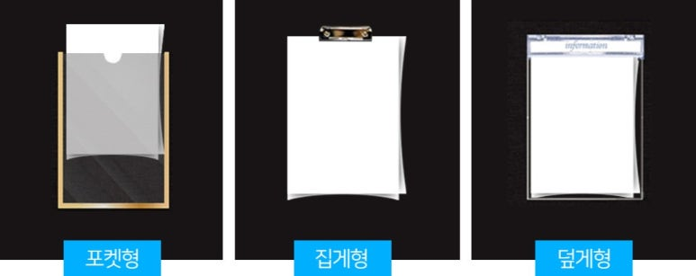 포켓형은 문서를 넣고 빼기 편리하며, 집게형은 빠르게 공지를 교체할 때 유용합니다.